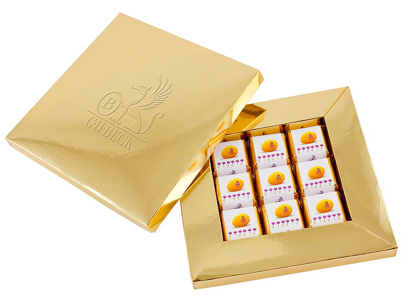 Šokolaadikarp, milles on 9 piimašokolaadi erinevate maitsetega. Kommid on pakendatud kuldsesse paberisse, mille ümber on Teie kujundusega paber. Karp on kaheosaline, millele trükitakse Teie poolt soovitud kujundus.