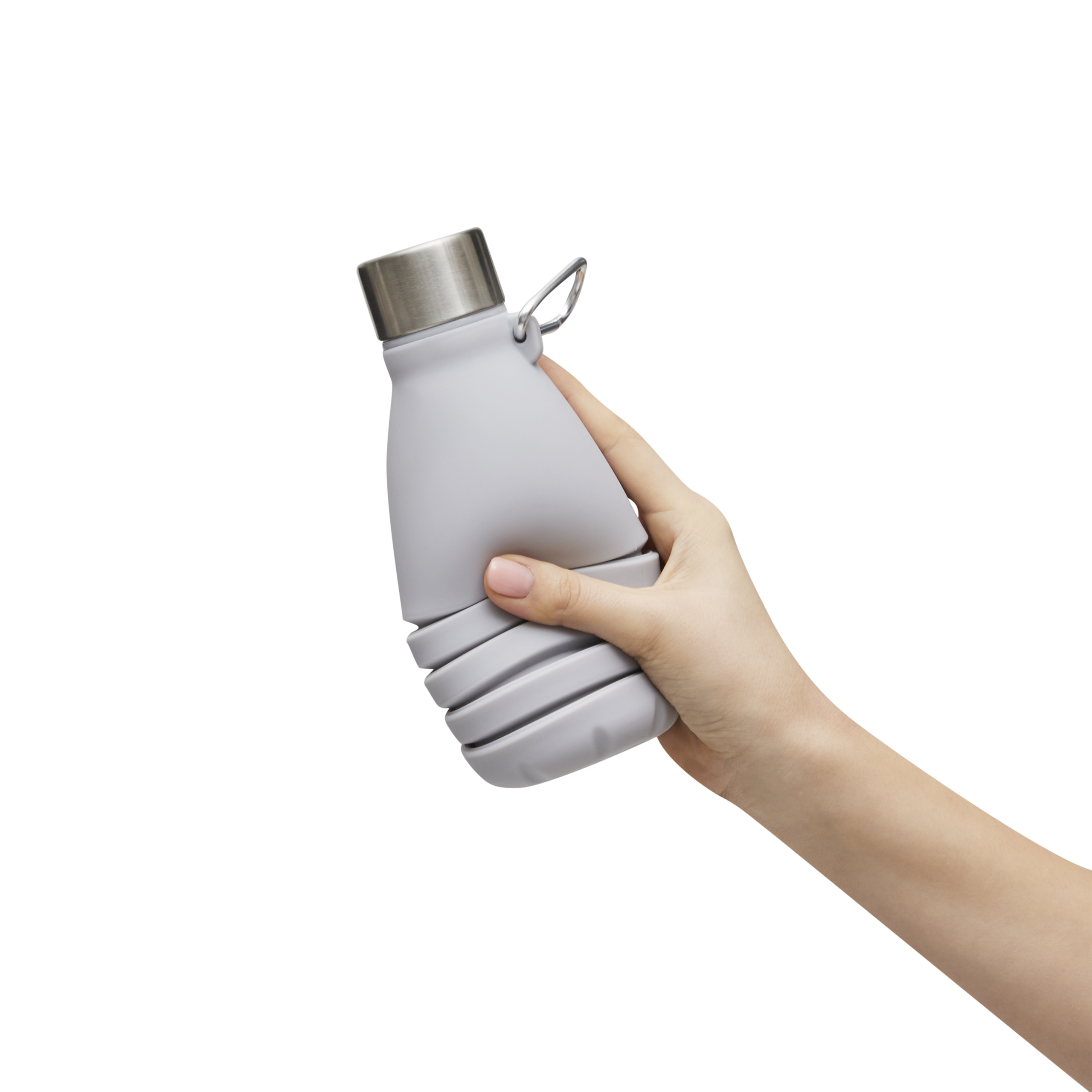 Kokkupandav joogipudel BIG GETS SMALL: keeratava roostevabast terasest korgi ja silikoonist tihendusrõngaga, alumiiniumkarabiiniga (karabiin EI SOBI ronimiseks), pudelit saab pikendada ja voltida ca. 8 cm, mahutavus u. 550 ml