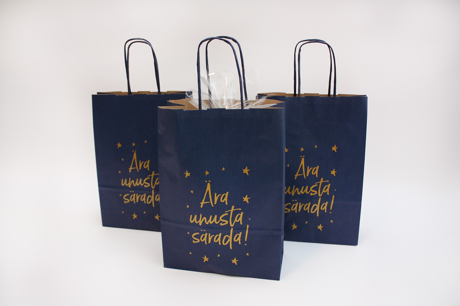 Kui soovid enda firmale silmapaistvaid paberkotte, siis aitame sind meeleldi. Valikus on erinevas suuruses ja värvivalikus paberkotte. Samuti on võimalus valida erinevate sangade ja paberipaksuse vahel. Võimalus on saada tavalisi paberkotte, ökokotte ning lamineeritud paberist kotte. Lamineeritud kottide puhul on võimalik valida kas matt-või läikiv laminaat.