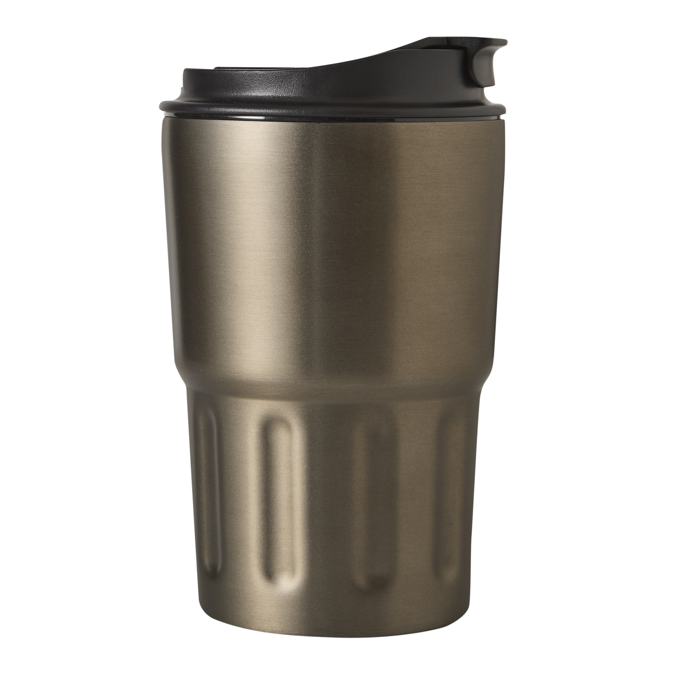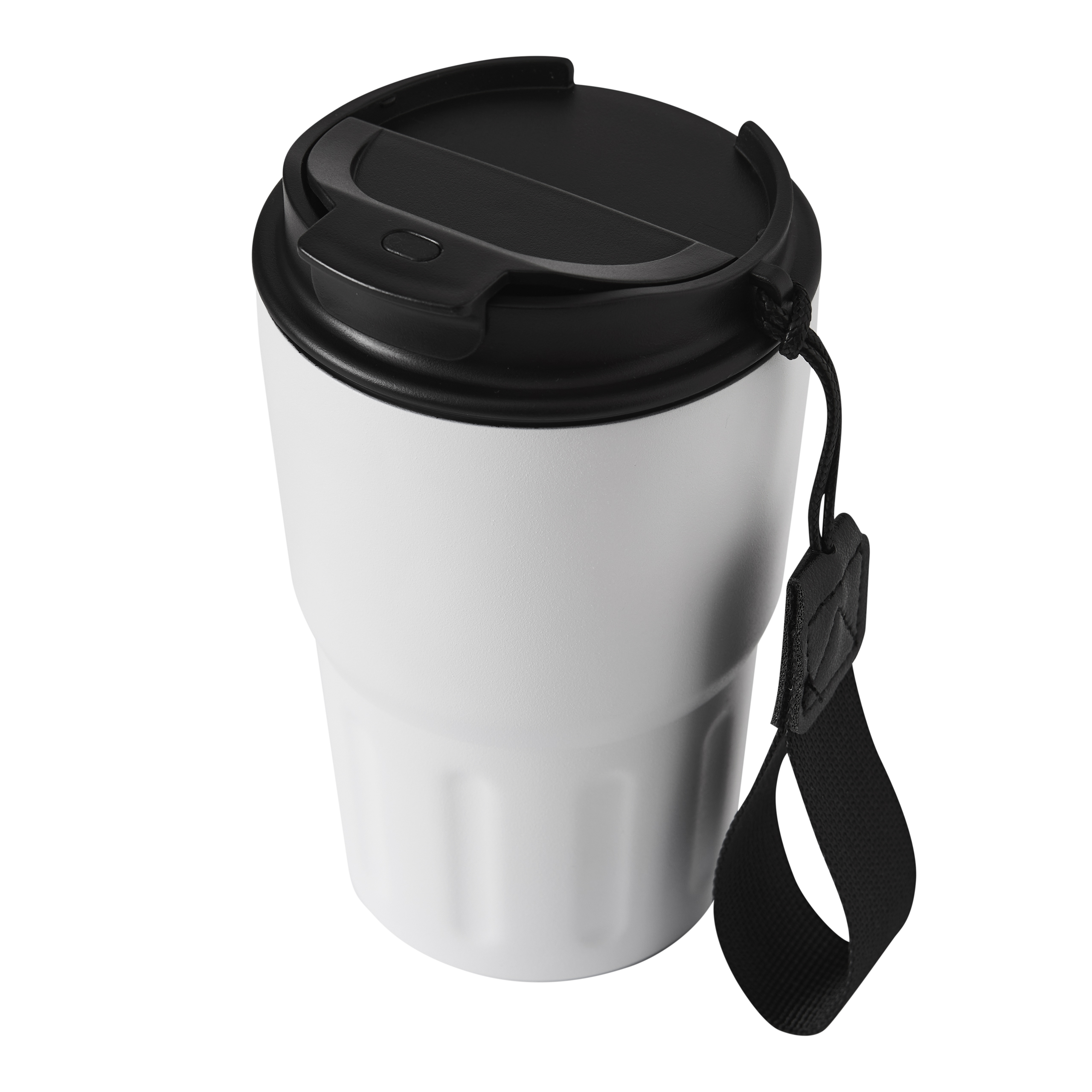 Soojustatud kruus TRAVEL MUG, topeltseinaga: seest ja väljast roostevabast terasest, plastikust kaas kindla keeratava korgiga, silikoontihend ja integreeritud joogiava, mahutavus ca. 400 ml, taaskasutatud plastikust randmerihm.