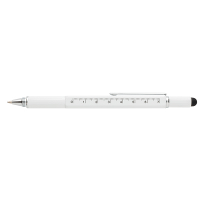 Multifunktsionaalne pliiats joonlauaga (7cm), vesiloodi, kruvikeeraja, hariliku pliiatsi otsa ja sinise kirjutustindiga pastapliiatsiga (kuni 400m). Valmistatud kvaliteetsest messingmaterjalist alumiiniumklambriga.