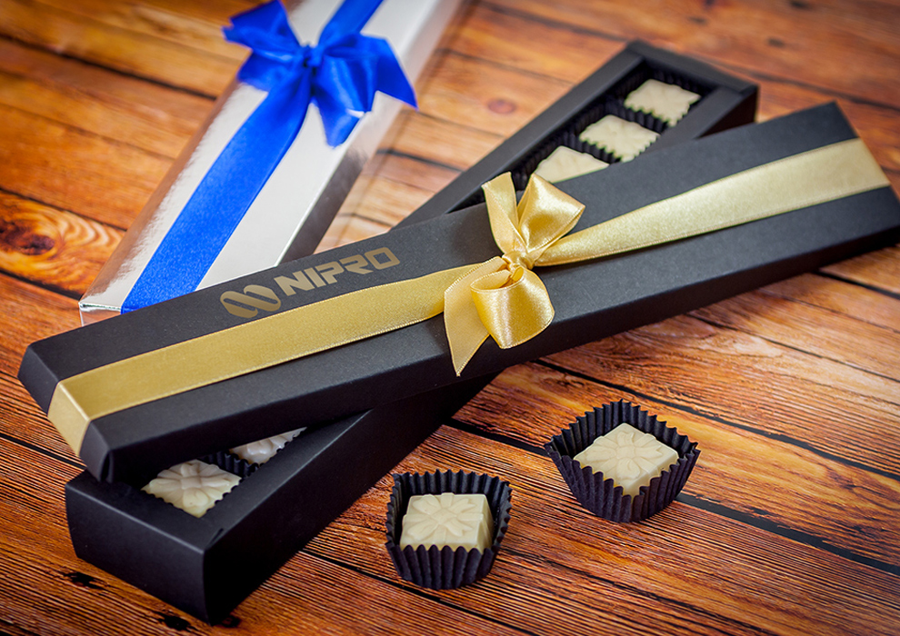 Shokolaadikarp, kus on kümme shokolaadi kommi, mis on tehtud piimashokolaadist või valgest shokolaadist.